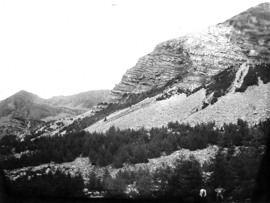 [9-9] Août 1887 – Résultat d’une avalanche en 1872 dans la forêt communale. Eboulements marneux sur la rive gauche du torrent de Bourdous. Au fond la Tête de l’Encombrette (2662 m), le Pas des muletiers © Fonds R.T.M 06