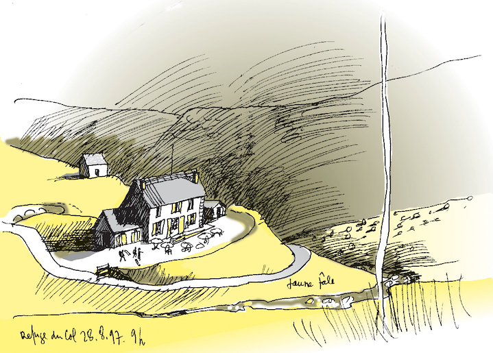 Refuge du col de la Cayolle, encre, lavis, aquarelle, 1997
