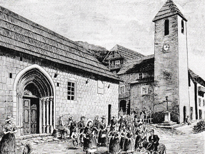 Ce dessin réalisé en 1985 a illustré l'article de Pierre Auda intitulé la retraite pascale, jadis à Saint-Martin d'Entraunes, article paru dans la revue Lou Sourgentin (mars-avril 1986), revue auquelle il apporta souvent sa collaboration artistique.
