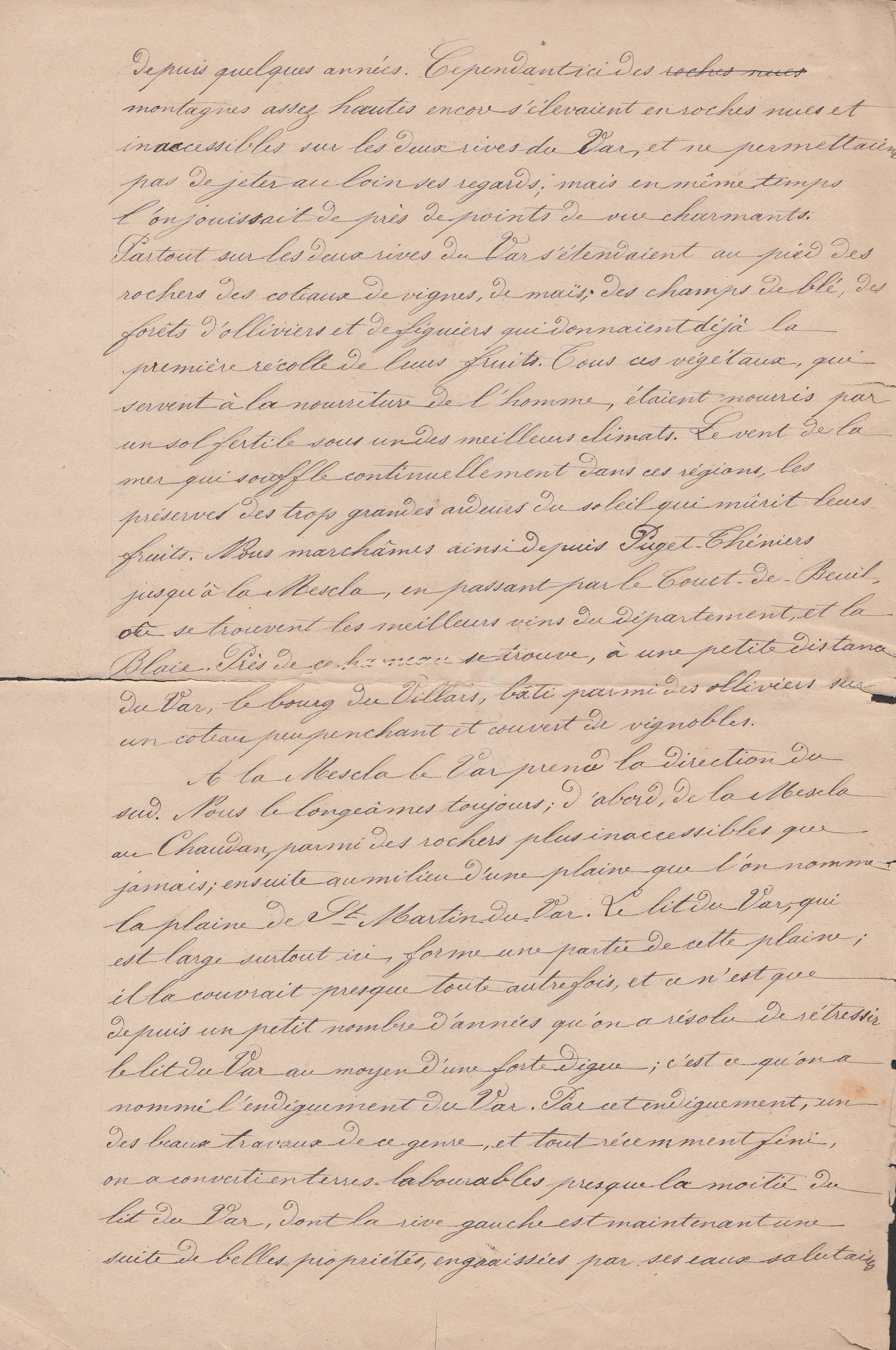A la Mescla, le Var prend la direction du sud. Nous le longeâmes toujours. D’abord de la Mescla au Chaudan parmi des rochers plus inaccessibles que jamais; ensuite au milieu d’une plaine que l’on nomme la plaine de St-Martin du var. Le lit du Var, qui est large surtout ici, forme une partie de cette plaine; il la couvrait presque toute autrefois, et ce n’est que depuis un petit nombre d’années qu’on a résolu de rétrécir le lit du var au moyen d’une forte digue; c’est ce que l’on a nommé l’endiguement du Var. Par cet endiguement, un des beaux travaux de ce genre, et tout récemment fini, on a converti en terres labourables presque la moitié du lit du Var, dont la rive gauche est maintenant une suite de belles propriétés, engraissées par ses eaux salutaires et qui s’étendent en une vaste et belle plaine, que termine un plateau latéral ombragé de pins et d’oliviers, depuis St Martin du Var jusqu’à Nice. Sur la digue même repose la route, où roulent presque continuellement un nombre de voitures qui font le service de Nice à Roquebilière, par la Vésubie, que le Var reçoit au Chaudan; de Nice à St Sauveur par la Tinée que le Var reçoit à la Mescla; de Nice à Puget-Théniers et de là dans les Basses-Alpes, par le Var. Ce trajet avait pris toute la nuit; cette nuit me parut assez longue, à moi qui n’avait pu dormir: aussi attendais-je la venue du jour avec impatience, afin de pouvoir contempler le pays qui s’offrait à ma vue. Le jour) vint bientôt en effet. Nous étions encore à environ 10 km de Nice. Cependant le pays avait beaucoup changé, les montagnes qui bordent le lit du Var n’offraient plus le même aspect que celles que j’avais remarquées jusqu’au Chaudan.