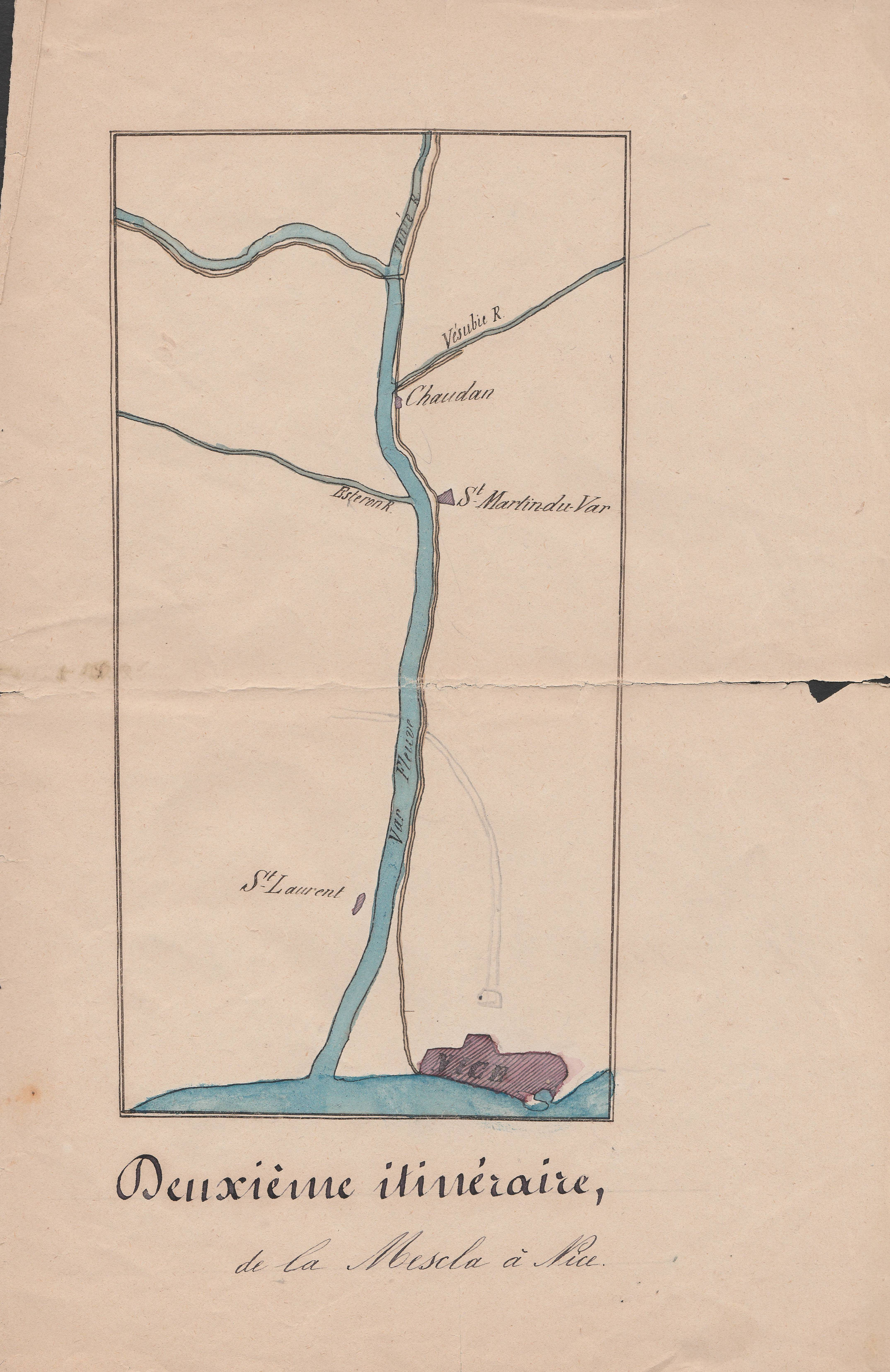 Arrivés le 28 juillet au matin, nous repartîmes le 30 juillet au soir. Arrivés à la Mescla, je montai, comme vous les avez, l’étroite vallée de la Tinée et me rendis à Clans, voir mon oncle. Je remarquai durant ce trajet que la vallée de la tinée est beaucoup plus étroite que notre vallée du Var. La rivière coule dans un lit pierreux, encaissé parmi des rochers et loin des propriétés qui se trouvent sur les plateaux. Aucune chose nouvelle ne frappa ici mes yeux; les coteaux y sont couverts de châtaigniers; seulement je remarquai que la frénésie féodale était fortement enracinée dans ces pays dont les sites offrent pour la plupart l’aspect le plus accidenté et le plus grandiose.