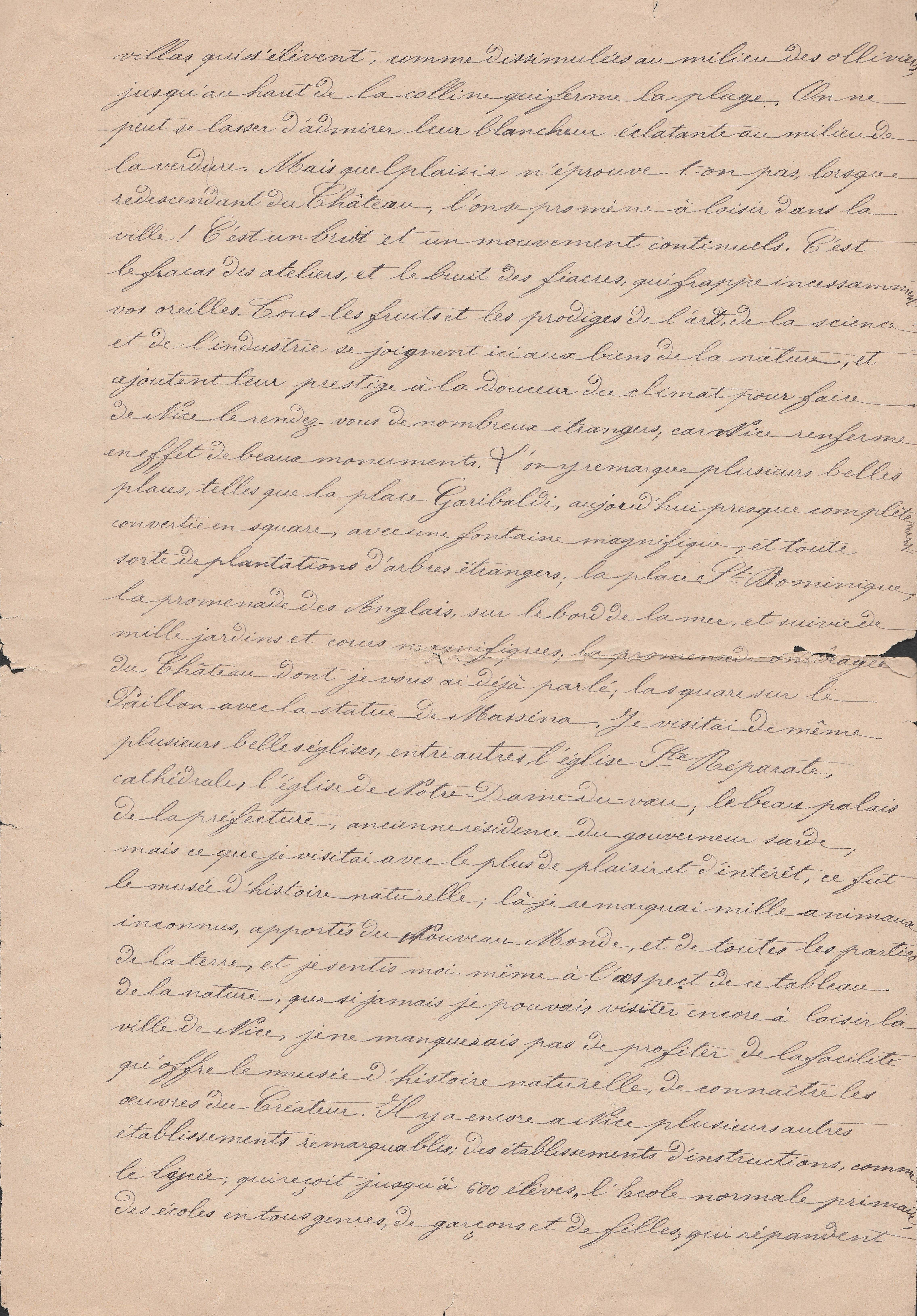 là je remarquai mille animaux inconnus apportés du Nouveau-Monde, et de toutes les parties de la terre, et je sentis moi-même à l’aspect de ce tableau de la nature, que si jamais je pouvais visiter à loisir la ville de Nice, je ne manquerai pas de profiter de la facilité qu’offre le musée d’histoire naturelle, de connaître les œuvres du Créateur. Il y a encore à Nice plusieurs autres établissements remarquables; des établissements d’instructions, comme le lycée qui reçoit jusqu’à 600 élèves, l’Ecole normale primaire, des écoles en tous genres, de garçons et de filles, qui répandent l’instruction, deux salles d’asile et deux crèches ; il y a aussi à Nice deux théâtres, l’un français, l’autre italien, et une bibliothèque de 40 000 volumes, où l’on peut s’instruire; je sens que si je pouvais je profiterais de cette facilité de pouvoir s’instruire.