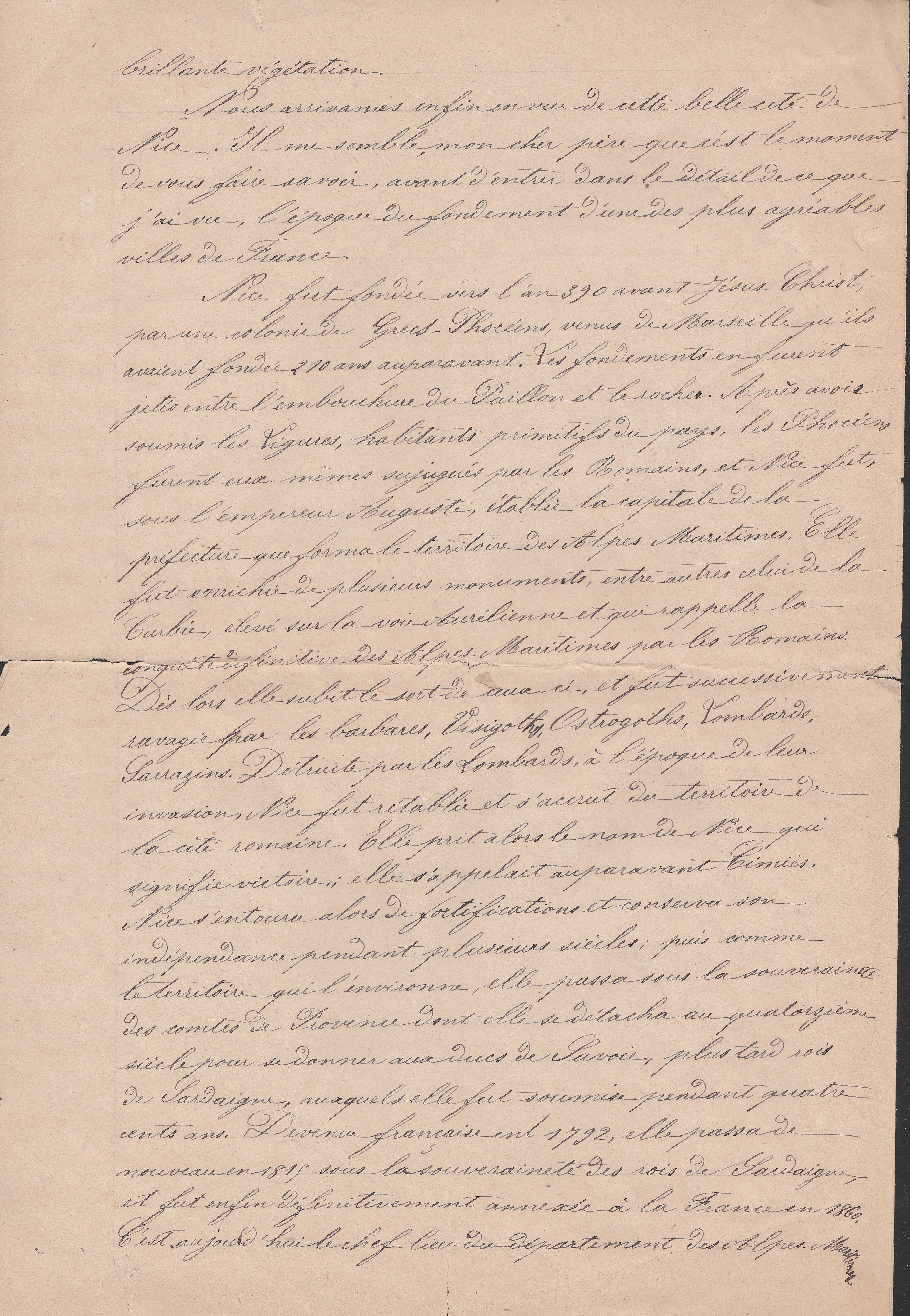 Déjà l’on voyait que l’on n’était plus dans la triste région où j’ai passé les jours de mon enfance. C’était la belle campagne de Nice, que Thomas a si bien dépeinte, qui s’offrait tout entière devant nous. Déjà des végétaux nouveaux attiraient sans cesse mes regards surtout l’oranger dont j’aime tant le fruit; de splendides villas où un grand nombre d’étrangers, surtout anglais viennent habiter pendant l’hiver, s’élevaient çà et là éparses sur cette belle plage de Nice que décore la plus brillante végétation.