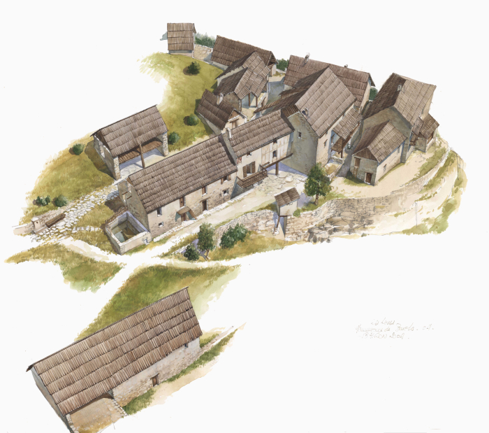Les Laves, hameau de Barels, dessin J-B Héron, 2004. Le mélèze domine : bardeaux sur les toits, poteaux porteurs, balcons et ossature en pan de bois pour la maison au centre du hameau.
