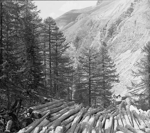 Exploitation forestière dans la vallée de la Vésubie, vers 1890. Fonds Andreani, collection Bibliothèque de Cessole, Ville de Nice