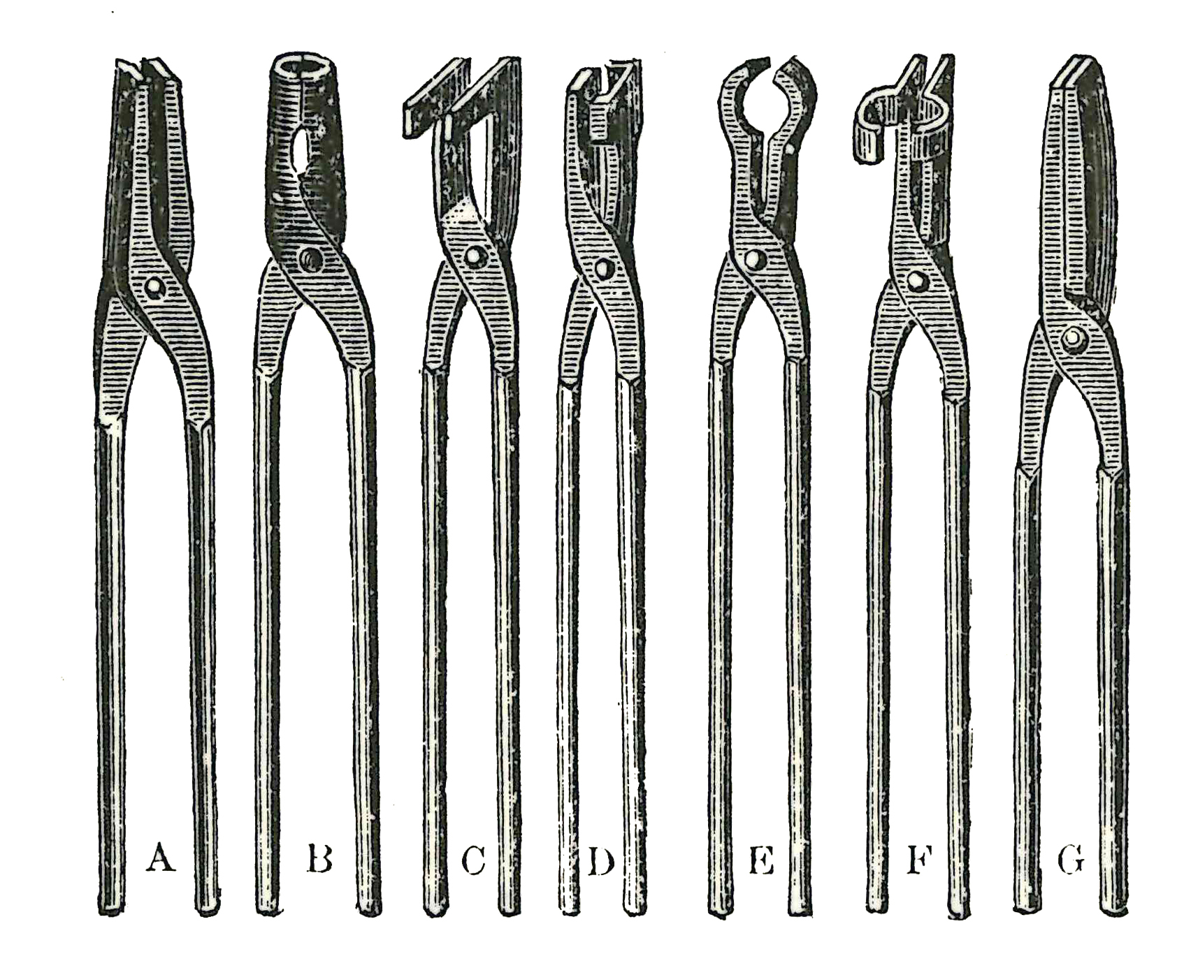 A et G : tenailles droites et plates - B : tenaille droite et creuse dite à coquille - C : tenaille à crochet et plates - D : tenaille à demi coquille - E : tricoise - F : tenaille à crochet rond (Martin-Darbel M. G., Manuels-Roret du charron-Forgeron,1923)
