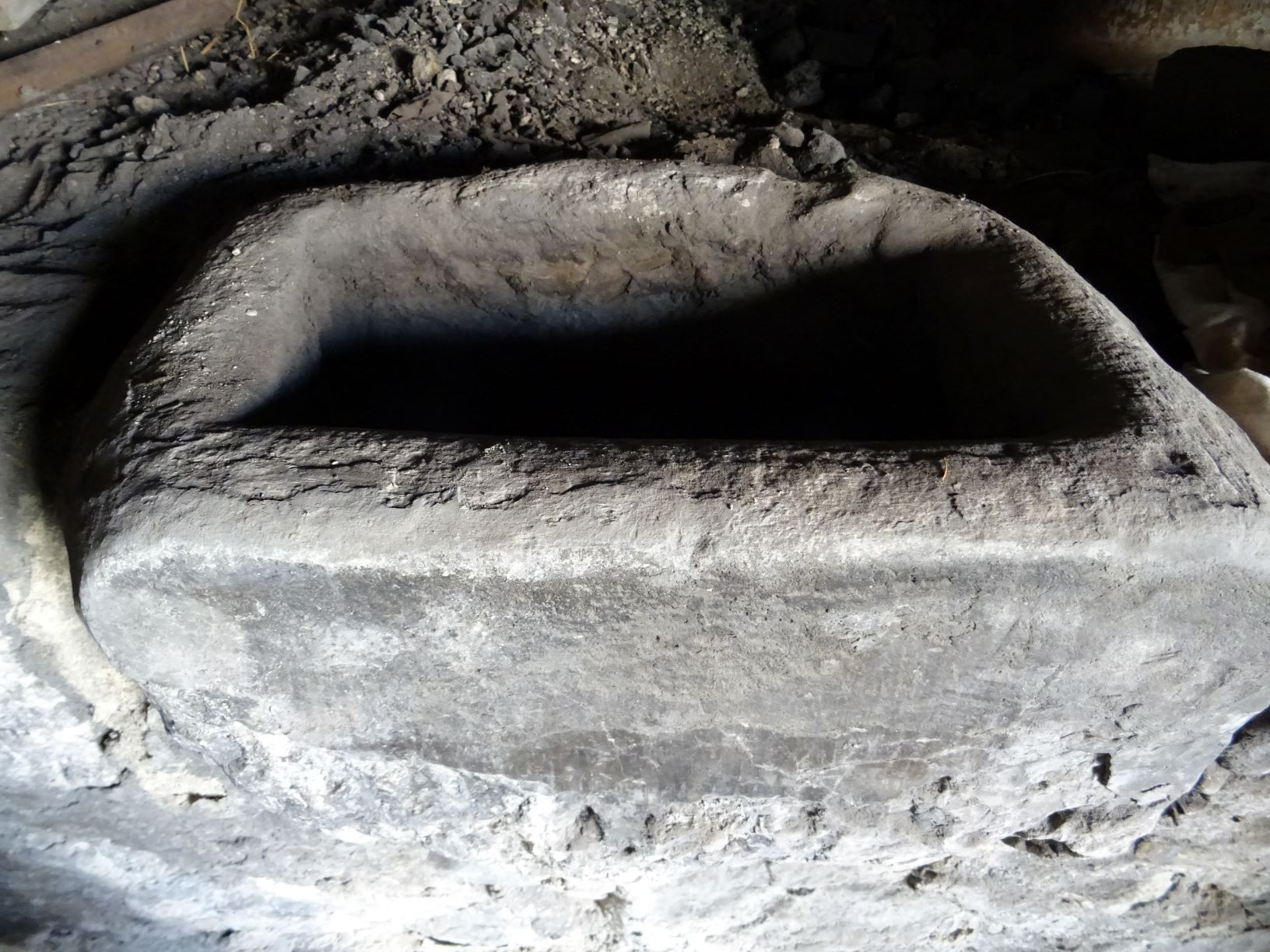 Sur le devant de la forge est scellé un bac en grès destiné à la trempe à l’eau dite sèche. La trempe consiste à plonger dans un bain froid (ici de l'eau) un métal, un alliage porté à haute température pour conserver à température ambiante une modification de la structure moléculaire obtenue à chaud et augmenter ainsi la dureté des métaux. Ce traitement était généralement effectué juste avant l'affutage des outils tranchants en acier forgé. Il consistait à porter l'extrémité qui sera affutée à la température du rouge cerise clair (plage de température : 900 à 950 °C environ) puis à plonger très rapidement la pointe dans l'eau froide. Marcel Galfré, garçon de forge entre 1945 et 1949 se rappelle que la trempe à l'eau était rare et suppose qu'elle était utilisée pour les burins de maçonnerie.