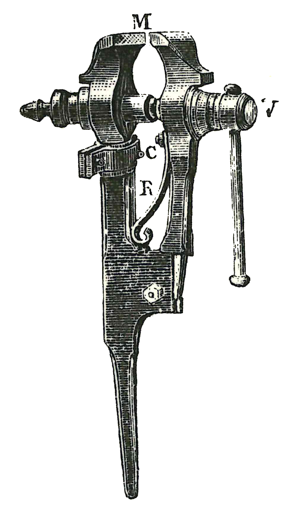 M : mâchoires(aciérées et bien trempées présentant les aspérités d'une lime) - R : ressort (pour écarter les deux mors) - C : collier visé sur l'établi (permet la rotation de l'étau) - V : vis filetée (Martin-Darbel M. G., Manuels-Roret du charron-Forgeron,1923)