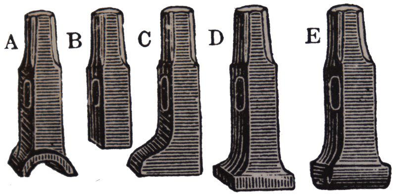 A : sur- étampe - B : étampe carrée- C : étampe à talon - D: chasse à parer - E : chasse ronde (Martin-Darbel M. G., Manuels-Roret du charron-Forgeron,1923)