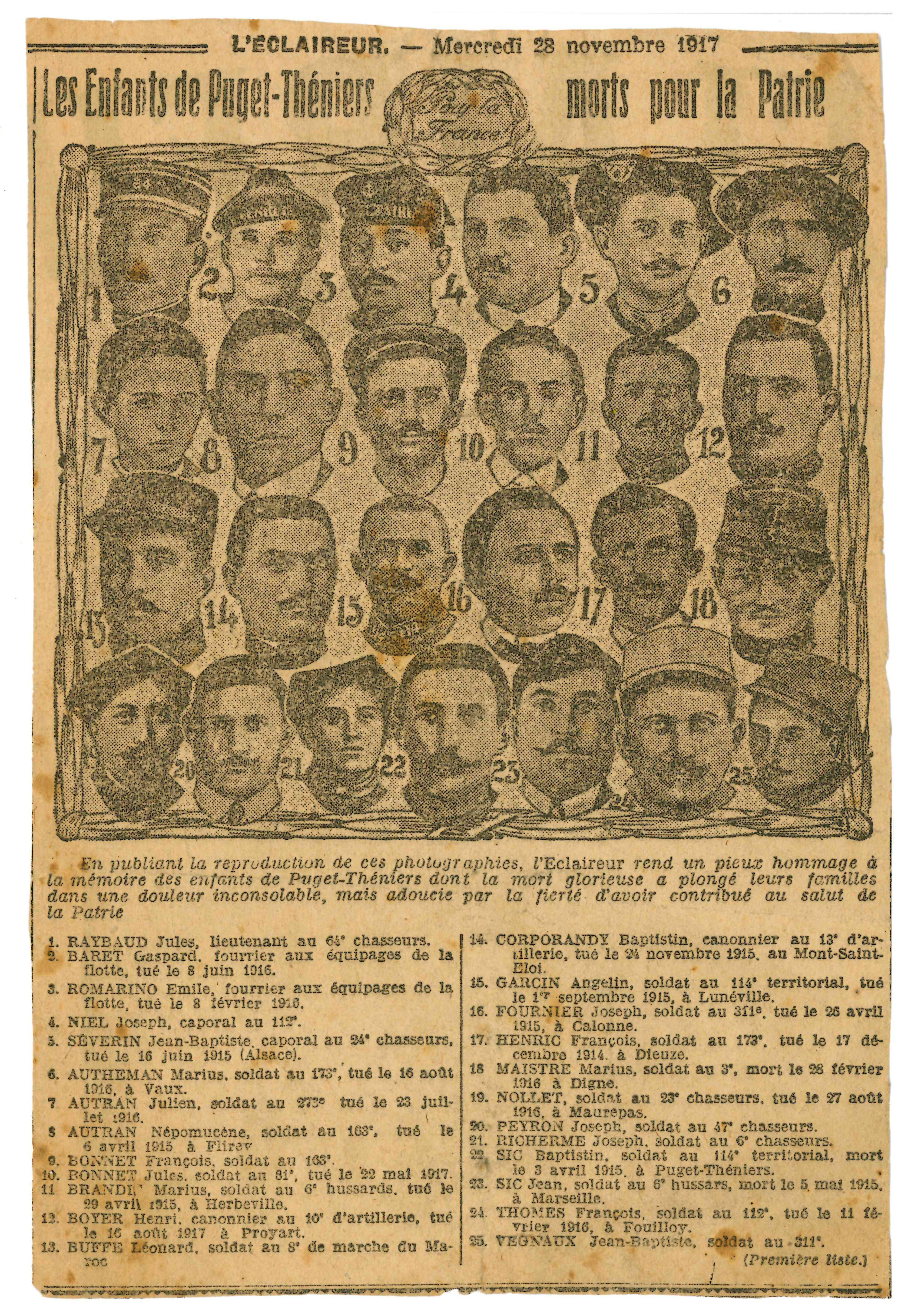 Les enfants de Puget-Théniers morts pour la patrie. L'éclaireur de Nice du 28 novembre 1917.