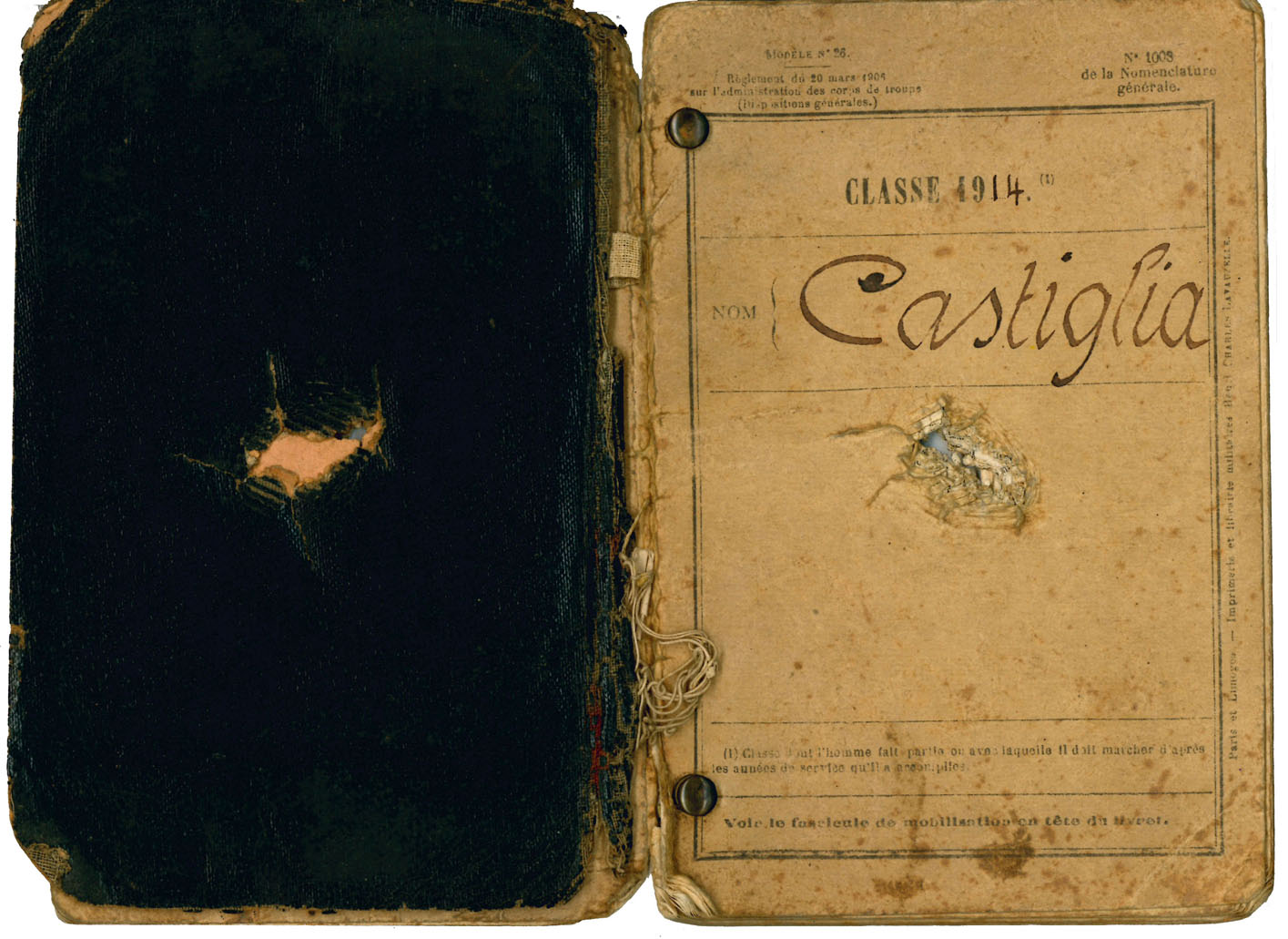 A gauche, Ludovic Castiglia affecté au 163ème Régiment d'Infanterie. A droite, Le livret militaire de Castiglia percé d'une balle. La croix qui se trouvait derrière le livret a stoppé la balle en lui sauvant la vie.