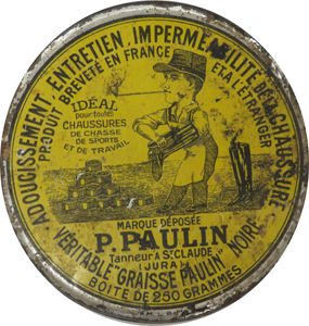 A gauche, Jeu de dominos ; A droite, Boîte de cirage "Paulin"