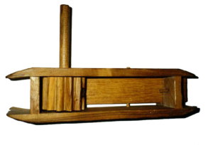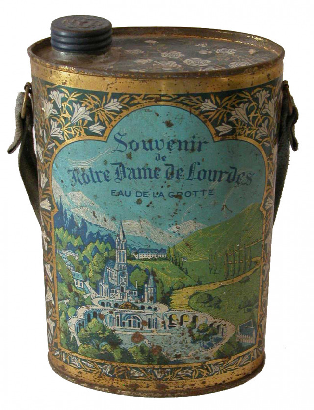A gauche, Une gourde provenant de Lourdes. A droite, Crécelle (coll. Roudoule)
