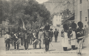 Dans plusieurs localités, notamment à Auvare, Villars, Entrevaux et Guillaumes, on faisait la bravade lors de la fête patronale. Encore attestée dans les années 1880, cette coutume n’a pas survécu à la Première Guerre Mondiale. Des volontaires formaient, pour la circonstance, la compagnie des bravadiers armés de vieux fusils de chasse, tromblons et autres armes à feu démodées, sous les ordres d’un capitaine paré, d’un baudrier et d’un grand sabre. La Compagnie parcourait le village en rendant honneur à qui de droit. Au moment de l’offertoire, la compagnie pénétrait dans l’église, tambour battant, fifre sifflant ; elle avançait vers l’officiant, comme pour l’offerte, saluait les reliques d’une salve. Puis elle se rangeait dans la nef. A Guillaumes où la coutume a survécu, la compagnie des bravadiers est complétée par un piquet d’honneur de huit hommes portant l’uniforme des sapeurs du premier Empire. Ces soldats, originaires du village, firent le vœu, selon la légende, lors de la campagne de Russie en 1814, de rendre honneur à la Vierge, le jour de son Assomption, s’ils revenaient vivants. Le choix du jour de l’Assomption de la Vierge, le 15 août, n’est par un hasard. Louis XIII, fit de la Vierge Marie, la patronne de France, et ce jour correspond à la saint Napoléon. Bravade à Guillaumes, début XXe siècleGuillaumes, Sapeurs de l'Empire, 2006