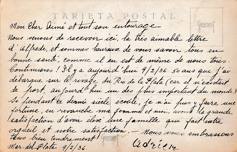 Après avoir quitté Tucuman, il retourne s’installer à Buenos Aires et, n’ayant qu’une petite cinquantaine, reprend peut-être quelques activités, François évoque le commerce du bois au début des années 1920 (95). Mais il passe la belle saison dans la station balnéaire de Mar del Plata où il possédait une vaste demeure –autre preuve d’un train de vie confortable- dans laquelle il avait plaisir à réunir souvent les siens.