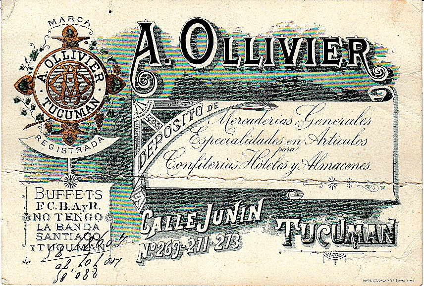 En Argentine cependant leurs destins vont un peu se séparer puisqu’Adrien, répondant en cela aux désirs du gouvernement qui souhaitait que l’immigration permette la mise en valeur de l’espace continental, ne reste pas à Buenos Aires mais gagne, à un millier de kilomètres au Nord-Ouest la province de Tucuman. Il s’agit d’une petite région (22 500 km2) peu peuplée (215 000 habitants au recensement de 1895) à cheval sur les contreforts andins et les plaines du Chaco. Le chemin de fer venait de la mettre à une vingtaine d’heures de la capitale. Et, à proximité du tropique du Capricorne, bénéficiant d’un climat chaud et arrosé de novembre à avril (l’été austral), elle commençait à connaître une belle période d’expansion économique et démographique portée par la culture de la canne à sucre dans les plaines de l’Est. C‘est dans la capitale administrative, San Miguel de Tucuman, une petite ville de 34 000 habitants en 1895, que s’installe Adrien Ollivier. Renouant avec l’esprit d’entreprise de son aïeul François-Hyacinthe, il y crée une maison de commerce en 1891.