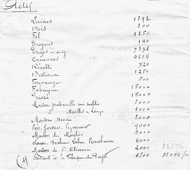 La part de François est constituée des moulins à farine et à huile de noix, de la part arrière de la maison paternelle ainsi que du tiers d’une autre habitation, et de nombreuses propriétés foncières, l’ensemble étant estimé à 11 500 francs. De son côté, Césaire se voit attribuer d’autres terres mais surtout la fabrique, l’essentiel de la maison paternelle et les 2/3 des autres maisons pour un total de 15 000 francs dont 4000 pour les « engins » de la manufacture dont le détail qui témoigne de la dimension de l’entreprise est ainsi précisé : « … quatre cardes formés avec divers cilindres, deux machines à filer dont l’une dite muginié (45 ) avec cent vingt roues et l’autre dite ingrosso avec trente roues, six machines pour tisser le drap, trois foulons pour le drap, trois chaudières pour teindre, une machine pour raser le drap et une autre dénommée garnissage et une autre avec ses relatifs cartons pour presser les draps ». François-Hyacinthe demande en outre à ses enfants d’entretenir à parts égales prise d’eau et canal et, dans les habitations divisées, de séparer par des murs leurs lots. Précaution en cas de mésentente future ? Cela devait effectivement arriver dans les années 1880. Et pour son compte il se retire des affaires –le voilà même indiqué « sans profession » dans un acte notarié de mai 1861 (46) ! - tout en conservant l’usufruit et certainement quelques ressources.