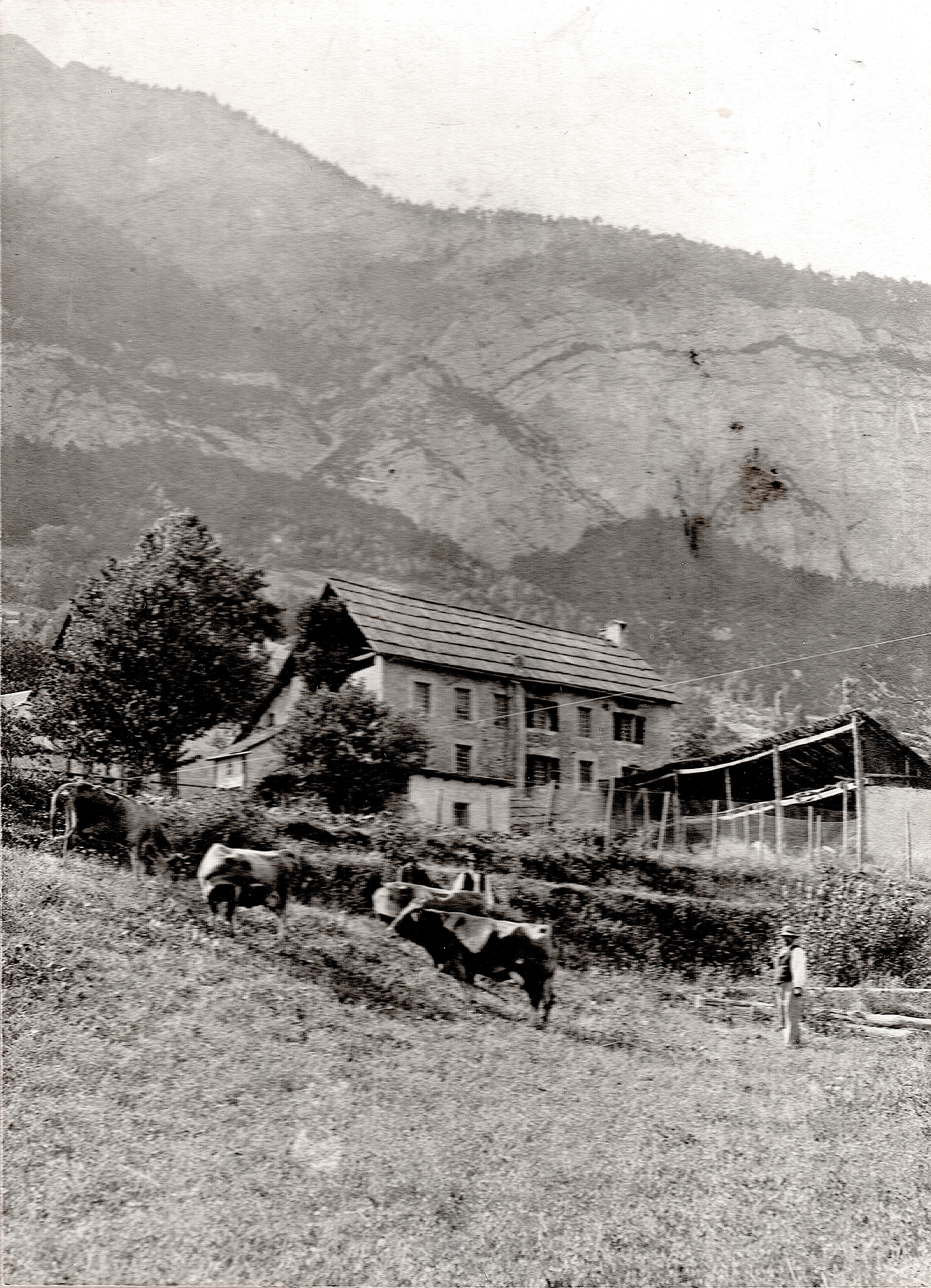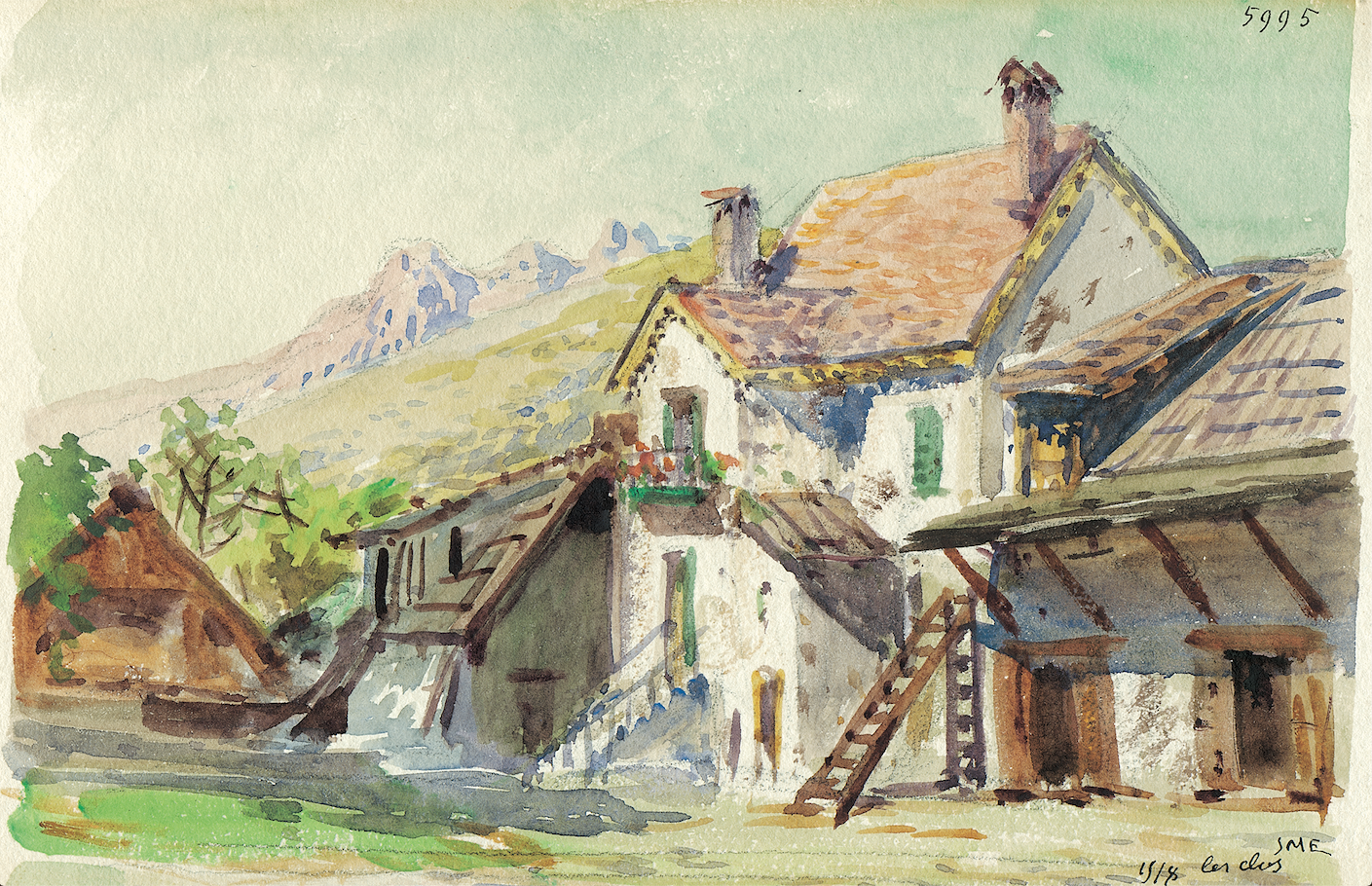 Césaire acquit, aux enchères après saisie, les biens des mineurs Arnaud en septembre 1873 pour un prix très faible (120 francs) mais, en février 1874, il est condamné, en compagnie d’un comparse, par le Tribunal correctionnel de Nice à 1000 francs d’amende pour avoir porté entrave à la liberté des enchères en faisant courir de faux bruits sur leur montant ; à l’occasion les biens sont estimés à 4000 francs (183) ! Puis en 1875, il est poursuivi devant le tribunal de première instance de Nice par un nommé Arnaud Balthazar, cordonnier à Draguignan de son état, qui, suite à cette affaire peu reluisante, lui réclame 6000 francs de dommages et intérêts. Tout en reconnaissant le bon droit du plaignant, le tribunal décide la nomination d’un conciliateur, le maire d’Entraunes Joseph Baudouin, pour procéder à une estimation (184). On ne sait ce qu’il en advint mais la maison demeura dans le patrimoine Ollivier et fut réhabilitée, surélevée, agrandie –ce qui dut coûter quelque argent mais c’est l’époque où Césaire recourt souvent à l’emprunt ! Estimée à 8000 francs en 1897, elle est désormais pour la famille devenue la « maison neuve », une grosse bâtisse blanche au toit de tuiles rouges, un couvert alors à la mode mais peu adapté en montagne. Bien visible de la route, elle est croquée par Alexis Mossa le 15 août 1919.