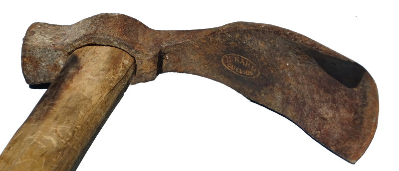 à gauche, brochoir. La tête rectangulaire sert à enfoncer les clous dans les fers et les sabots, la tête fendue permet l'arrache des clous.