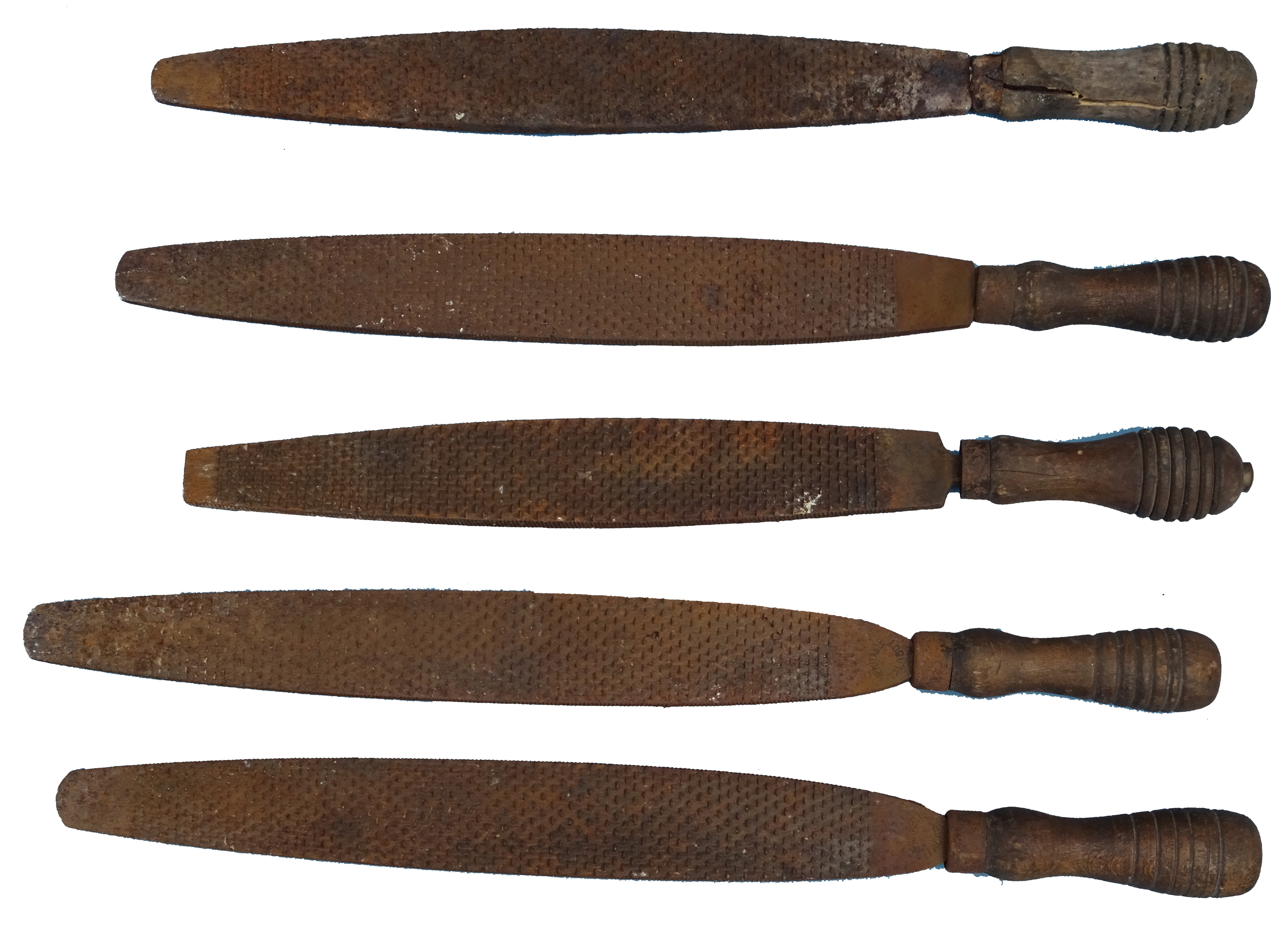 à droite, râpes. Elles sont utilisées pour râper le sabot. En fin de vie, elles sont recyclées et servent à la fabrication de nombreux outils, comme en témoigne plusieurs burins conservés dans la forge.