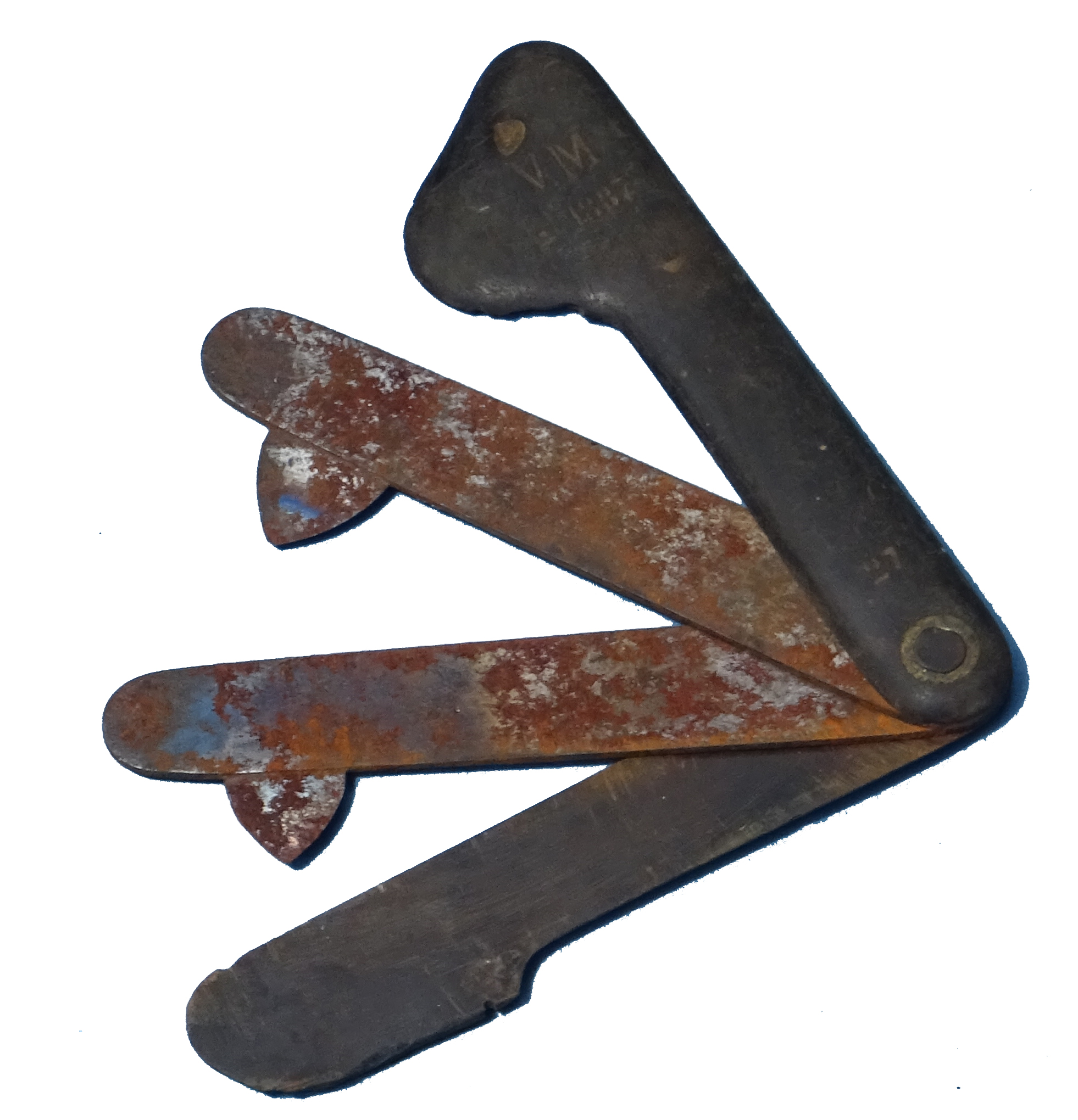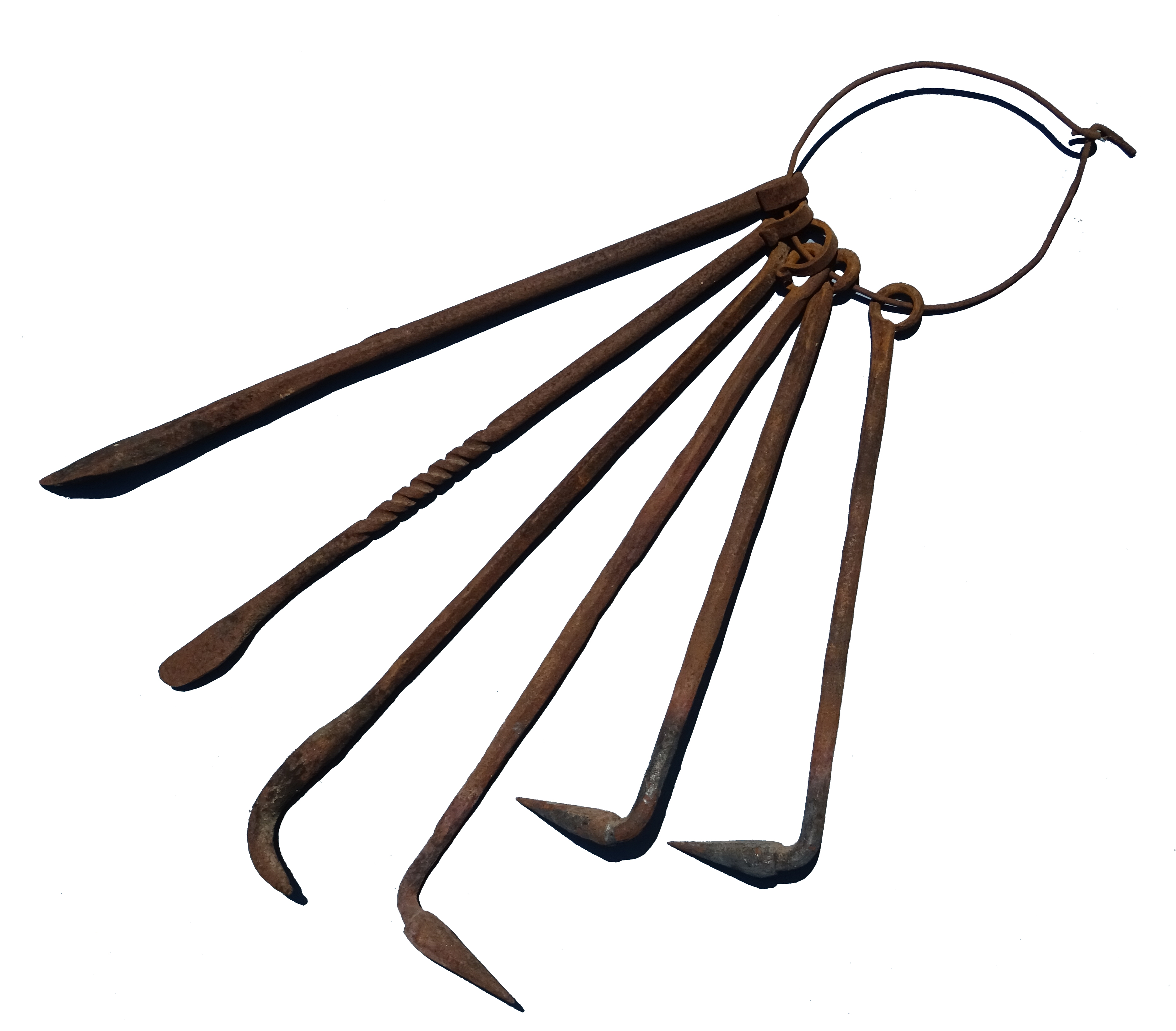 _à droite, trousse de vétérinaire. Sur un anneau en fil de fer pouvant s'ouvrir, se trouve six instruments vétérinaires : trois pointes à cautériser perpendiculaire à la tige les supportant, un crochet, deux couteaux dont l'un a été fabriqué à partir d'une mèche à bois de tarière recyclée.