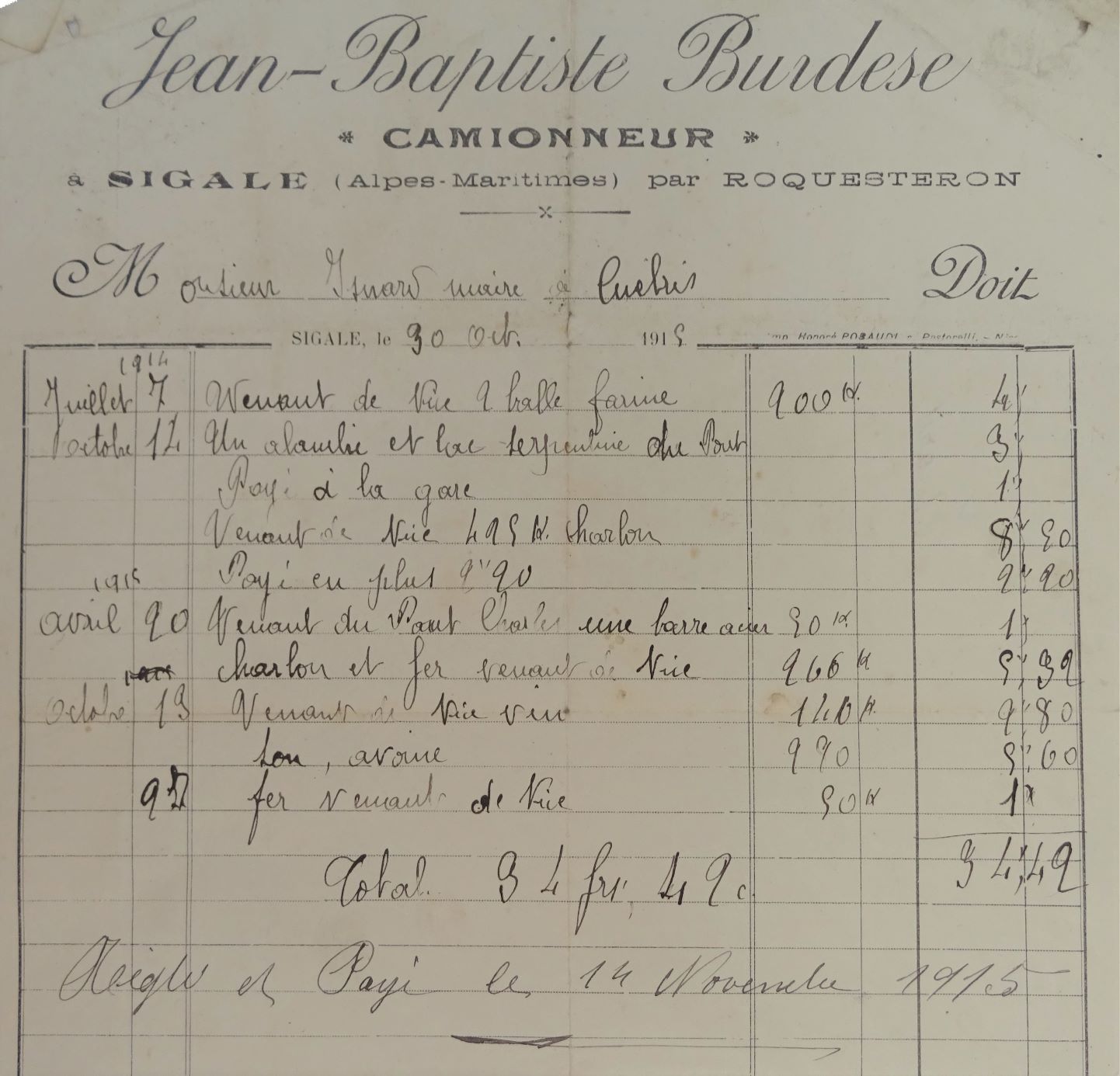 Le 14 octobre 1915 Jean-Baptiste Burdese, camionneur à Sigale livre un alambic à Eloi Isnard.