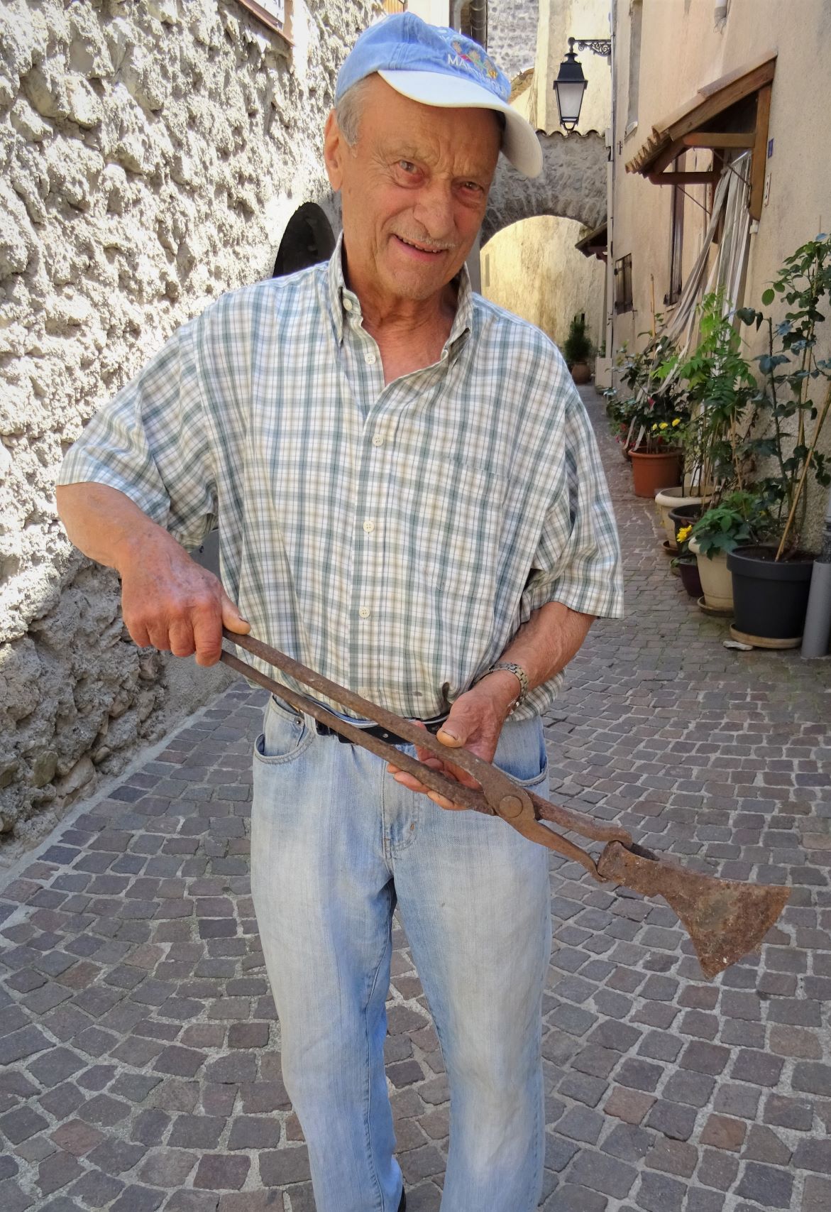 Marcel Galfré, tenant une tenaille à bouterolles. Cliché, P.Thomassin,Roudoule