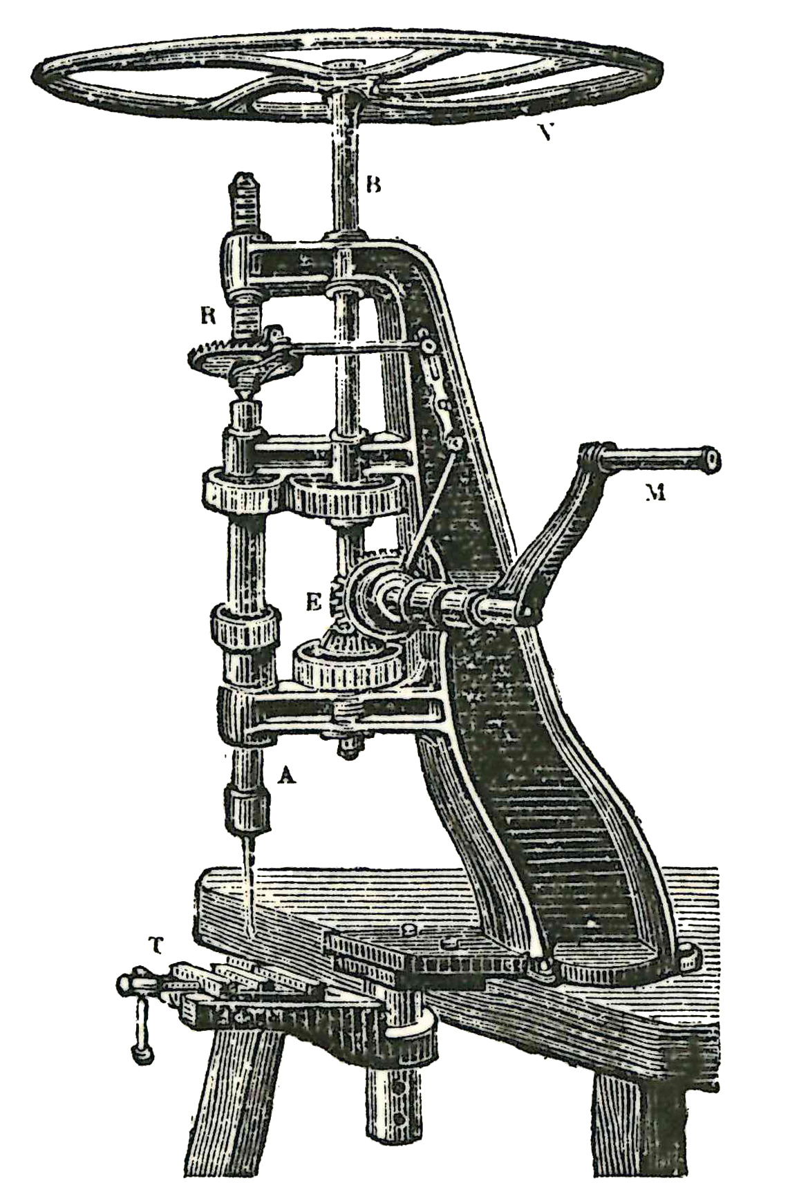 Perceuse avec un bâti en fonte se boulonnant sur une table. La perceuse est entraînée à l'aide d'une manivelle (M). Des engrenages coniques (E) transmettent le mouvement. Le foret (A) est fixé sur un arbre vertical . Un rocher (R) imprime le mouvement de descente au porte-foret. Un deuxième arbre vertical (V) est couronné par un volant (V). Ce volant ^permet l'entraînement et régularise le mouvement.