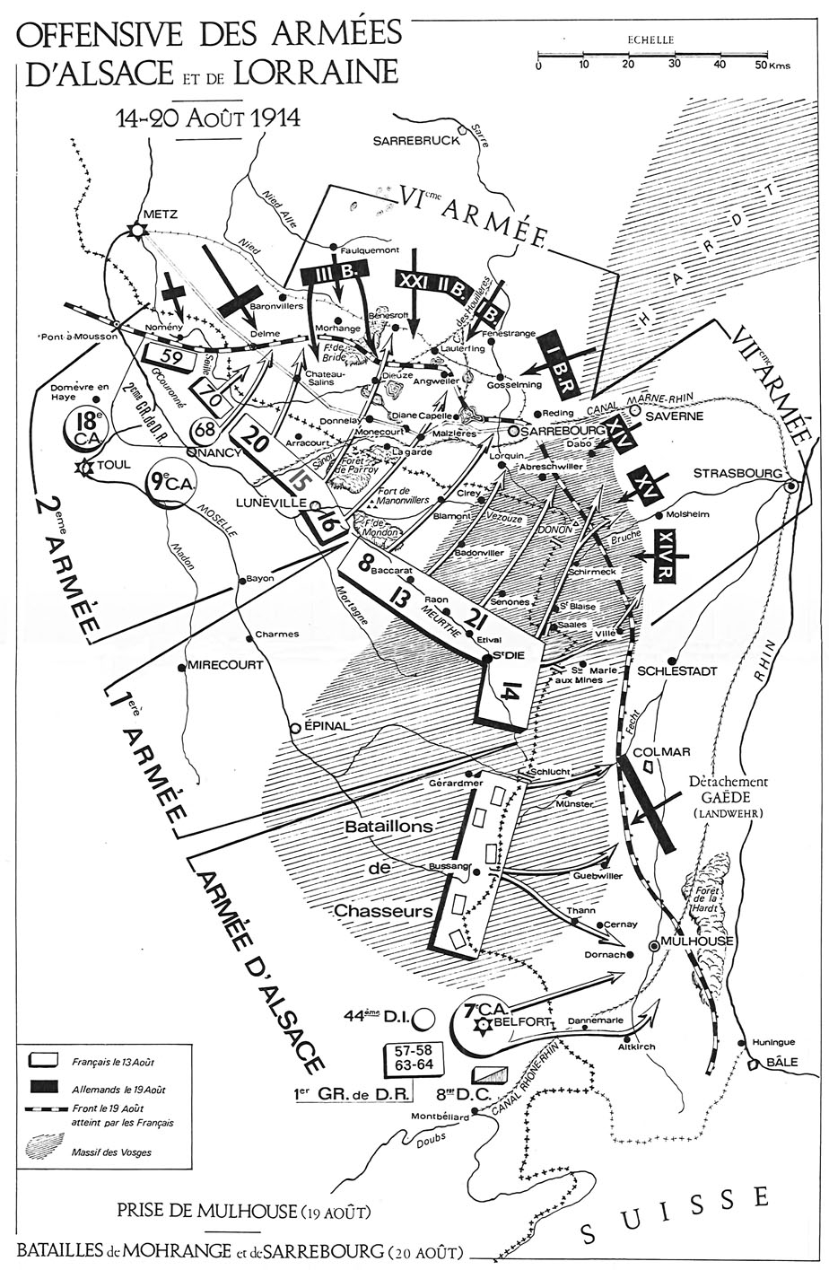Les bataillons de Chasseurs Alpins n’arrivent que le 13 août. Ils sont engagés à partir du 19 août. Le bataillon du 23e débouche à Dieuze, le 19, à 5 heures du matin, précédé par le 6e bataillon. Une courte résistance ennemie se produit à Vergaville. Le 23e appuie l’attaque du 6e en contournant le village par le sud-est. La résistance brisée, la progression continue au nord du village, dans une région peu accidentée, nue, dominée par les hauteurs de Bensdorf où sont les observatoires et les abris de l’artillerie lourde ennemie.[...]. Pris sous des feux violents d'artillerie sur un terrain repéré d'avance et parsemé de marécages, les alpins, encadrés par des officiers superbes, tiennent sur place avec le calme des vieilles troupes. Historique du 23e BCA. Durant ces deux journées de bataille, plus de 10 000 soldats méridionaux sont tombés au champ d’honneur. Les Pugétois se sont engagés dans le combat sans réserve. Marius ASTIER, Louis Rosé HENRIC et Jean Marius MEDAR sont capturés. Jean-Baptiste GOUJON, Jules Marius RAYBAUD et François Paul ROUBIN meurent pour la France.