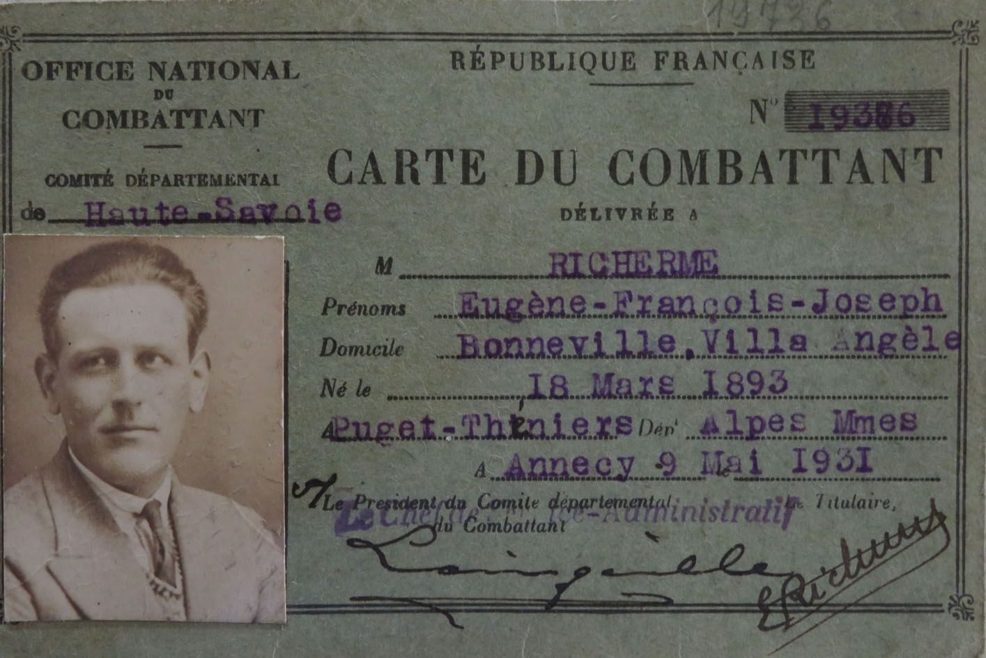 Eugène Richerme. Carte du combattant.