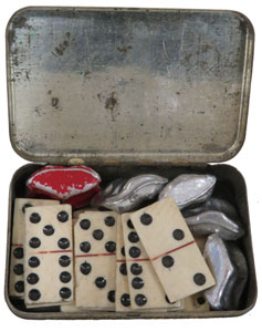 A gauche, Jeu de dominos ; A droite, Boîte de cirage "Paulin"