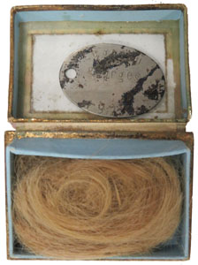 A gauche, Plaque d'identité et mèche de cheveux ; A droite, Carte postale à thème amoureux