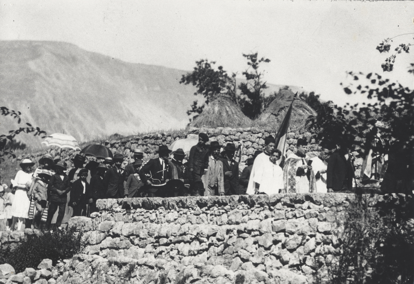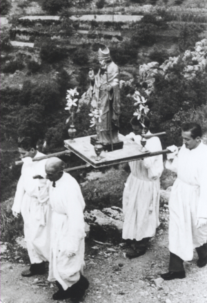 Processions d'hier. A partir de gauche, La Croix-sur-Roudoule, première moitiè du XXème siècle ; Saint-Barnabé, 1930 ; Saint-Julien, 1940 ; Saint-Jacques à Saint-Léger, première moitiè du XXème siècle ; La Croix-sur-Roudoule, 1960 ; Saint-Anne à Puget-Rostang, 1942 ; La Croix-sur-Roudoule, 1956